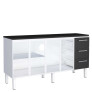 Sua estrutura é 100% em aço galvanizado — incluindo portas, base, laterais, frente de gavetas e prateleiras — com pintura eletrostática, o que assegura maior durabilidade, resistência à umidade e facilidade na limpeza. Os puxadores em ABS e os pés com 21 cm de altura e regulagem reforçam a praticidade e a robustez do móvel.