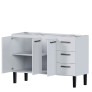 Sua estrutura é 100% em aço galvanizado — incluindo portas, base, laterais, frente de gavetas e prateleiras — com pintura eletrostática, o que assegura maior durabilidade, resistência à umidade e facilidade na limpeza. Os puxadores em ABS e os pés com 21 cm de altura e regulagem reforçam a praticidade e a robustez do móvel.