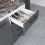O modelo conta com pés de 21 cm com regulagem de altura, facilitando o nivelamento no piso. As gavetas com corrediças metálicas possuem interior em polipropileno virgem, material altamente resistente a impactos e que não resseca com o tempo. Para maior organização, o gabinete dispõe de divisor de talheres, prateleira interna em aço e acabamento interno nas portas.