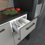 O modelo conta com pés de 21 cm com regulagem de altura, facilitando o nivelamento no piso. As gavetas com corrediças metálicas possuem interior em polipropileno virgem, material altamente resistente a impactos e que não resseca com o tempo. Para maior organização, o gabinete dispõe de divisor de talheres, prateleira interna em aço e acabamento interno nas portas.