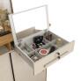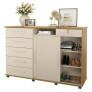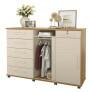 Cômoda Max New é uma peça multi-funcional. Na parte esquerda possui 5 gavetas com corrediças telescópicas que proporcionam abertura total da gaveta com deslizamento silencioso e macio. Na parte centro e direita temos 2 portas de correr em trilho de alumínio, um lado temos um cabideiro para organizar suas camisas, blusas e camisetas, na outra porta temos 2 prateleiras internas onde podemos usar como sapateira ou também para organizar suas roupas ou toalhas. Na parte superior temos espaço para aparelho receptor ou DVD e ao lado temos 1 gaveta com divisórias para bijuterias, chave e espelho. Ah!!! A Cômoda Max possui rodízios que facilitam na hora da limpeza, tampo feito em MDP 25 mm e Pintura é U.V proporcionando um perfeito acabamento. Fantástica, não é?