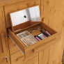Na parte central, o móvel dispõe de 6 gavetas com corrediças telescópicas, garantindo abertura suave e maior durabilidade. Uma das gavetas conta com espelho e chave, ideal para guardar objetos com mais segurança. Além disso, possui rodízios que facilitam a movimentação e limpeza.