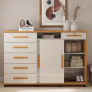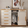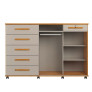Na lateral esquerda, a Cômoda Max New possui 5 gavetas com corrediças telescópicas, garantindo abertura total, deslizamento suave e silencioso. Já na parte central e direita, conta com 2 portas de correr com trilho de alumínio, sendo um lado com cabideiro e o outro com 2 prateleiras internas, que podem ser usadas como sapateira ou para organização.