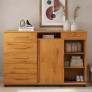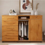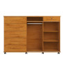 Na lateral esquerda, a Cômoda Max New possui 5 gavetas com corrediças telescópicas, garantindo abertura total, deslizamento suave e silencioso. Já na parte central e direita, conta com 2 portas de correr com trilho de alumínio, sendo um lado com cabideiro e o outro com 2 prateleiras internas, que podem ser usadas como sapateira ou para organização.