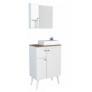 é formado por 01 espelheira tipo armário com porta escova, 01 toucador com pés de madeira, dobradiças com amortecimento nas portas e gaveta com corrediças telescópicas, ideal para organizar seu banheiro e produtos de higiene pessoal. Comprando agora o Kit Itaúna, vamos incluir gratis para você Cuba Prisma com Base para torneira, conforme imagem. Ah! Não acompanha a torneira, ok?