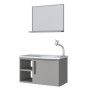 O gabinete Caju possui 1 porta com espaço interno para armazenar itens de higiene pessoal, além de 2 nichos que facilitam a organização do dia a dia. O lavatório curvo em mármore sintético adiciona um toque de sofisticação ao ambiente, enquanto a espelheira amplia visualmente o espaço e complementa o conjunto com elegância.