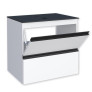 O gabinete Gaia dispõe de porta basculante com pistão a gás, que abre suavemente para baixo, garantindo conforto e segurança no manuseio. Possui também gaveta em aço com corrediças telescópicas, proporcionando abertura total e suave, além de puxadores em perfil de alumínio, que reforçam o estilo moderno do conjunto.