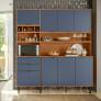 O conjunto conta com 7 portas, sendo 1 basculante com pistão a gás para abertura suave e prática, além de 2 gavetas com corrediças telescópicas que garantem maior durabilidade e facilidade no dia a dia. Seu nicho para micro-ondas otimiza o espaço, enquanto a adega para 4 garrafas traz um toque elegante à composição.