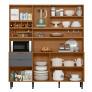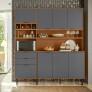 O conjunto conta com 7 portas, sendo 1 basculante com pistão a gás para abertura suave e prática, além de 2 gavetas com corrediças telescópicas que garantem maior durabilidade e facilidade no dia a dia. Seu nicho para micro-ondas otimiza o espaço, enquanto a adega para 4 garrafas traz um toque elegante à composição.