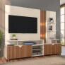 Um dos grandes diferenciais da Estante Home Cross, são os rodízios embutidos, facilitando muito na hora da limpeza. Não podemos deixar de falar das luminárias de LEDs embutidas atrás do painel que vai deixar sua sala um charme, além de moderna e aconchegante. Na parte inferior temos 4 portas articuladas e 1 prateleira de vidro temperado para maior segurança ;) O Home Cross tem Pintura U.V proporcionando mais qualidade e durabilidade, o detalhe na parte clara é com acabamento alto brilho ok? O tampo e base em MDP de 25mm dando um ar robusto ao ambiente. Ah! Possui espaço para TV de até 55 Polegadas que vai fazer da sua sala um verdadeiro cinema.