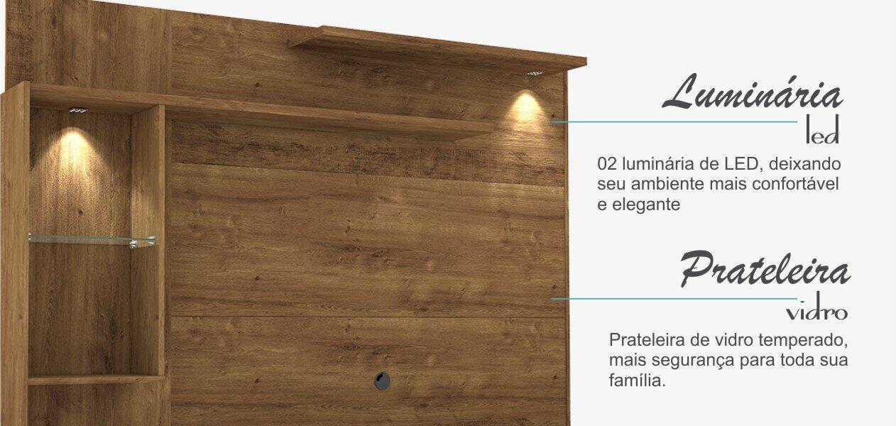 Na parte superior temos 2 prateleiras e 2 luminárias de LED, além de 1 prateleira de vidro temperado para expor objetos decorativos e espaço para TV até 60Polegadas. Na parte inferior do Home Oregon 1.8 temos 1 porta de correr e amplo espaço para objetos e aparelhos variados. Ah! os pés são de PVC a prova d'àgua :)