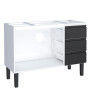 O modelo conta com pés de 21 cm com regulagem de altura, facilitando o nivelamento no piso. As gavetas possuem interior em polipropileno virgem, material que não resseca e é mais resistente a impactos. As portas são reforçadas com colunas internas, proporcionando maior firmeza estrutural, mesmo sem acabamento interno.