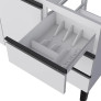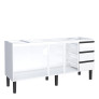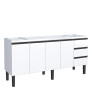 O modelo conta com pés de 21 cm com regulagem de altura, facilitando o nivelamento no piso. As gavetas possuem interior em polipropileno virgem, material que não resseca e é mais resistente a impactos. As portas são reforçadas com colunas internas, proporcionando maior firmeza estrutural, mesmo sem acabamento interno.