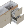O gabinete conta com 4 gavetas, sendo 1 interna, equipadas com corrediças telescópicas com abertura total e sistema de amortecimento (slow motion), oferecendo fechamento suave e silencioso. Possui ainda porta condimentos em aço, divisória interna e divisor de talheres, tornando o uso diário muito mais prático.