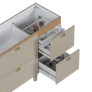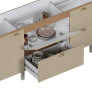 O gabinete conta com 4 gavetas, sendo 1 interna, equipadas com corrediças telescópicas com abertura total e sistema de amortecimento (slow motion), oferecendo fechamento suave e silencioso. Possui ainda porta condimentos em aço, divisória interna e divisor de talheres, tornando o uso diário muito mais prático.