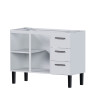 O modelo conta com pés de 21 cm com regulagem de altura, facilitando o nivelamento no piso. As gavetas com interior em polipropileno virgem não ressecam e são altamente resistentes a impactos, enquanto a primeira gaveta com divisor de talheres proporciona mais organização. Os puxadores em ABS completam o conjunto com praticidade e visual moderno.