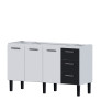 O modelo conta com pés de 21 cm com regulagem de altura, facilitando o nivelamento no piso. As gavetas com interior em polipropileno virgem não ressecam e são altamente resistentes a impactos, enquanto a primeira gaveta com divisor de talheres proporciona mais organização. Os puxadores em ABS completam o conjunto com praticidade e visual moderno.
