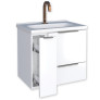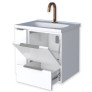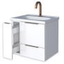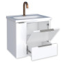 O modelo possui lavatório amplo em mármore sintético, gaveta com corrediças telescópicas de abertura total e porta basculante com pistão a gás, proporcionando mais conforto e praticidade no dia a dia. Seu design minimalista com puxador no mesmo aço do corpo e porta objetos exclusivo traz elegância e funcionalidade ao ambiente.