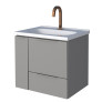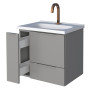 O modelo possui lavatório amplo em mármore sintético, gaveta com corrediças telescópicas de abertura total e porta basculante com pistão a gás, proporcionando mais conforto e praticidade no dia a dia. Seu design minimalista com puxador no mesmo aço do corpo e porta objetos exclusivo traz elegância e funcionalidade ao ambiente.