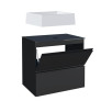 O modelo conta com gaveta com corrediças, puxadores em perfil de alumínio e porta basculante com pistão a gás, oferecendo abertura suave e excelente aproveitamento do espaço interno para organizar produtos de higiene e cuidados pessoais.