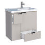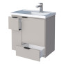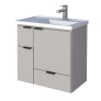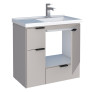 O modelo conta com 2 portas articuladas e 2 gavetas, proporcionando amplo espaço interno para organização de itens de higiene e limpeza. Possui puxadores em ABS com acabamento metalizado e acompanha lavatório em mármore sintético com borda sobreposta, agregando sofisticação e funcionalidade ao ambiente.