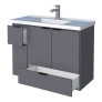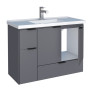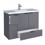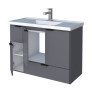 O modelo conta com 3 portas articuladas e 2 gavetas com corrediças metálicas, proporcionando amplo espaço interno para armazenar produtos de higiene e limpeza. Possui puxadores em aço e acompanha lavatório em mármore sintético com borda sobreposta, garantindo sofisticação e funcionalidade ao ambiente.