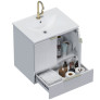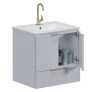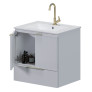 O gabinete possui duas portas com dobradiças com amortecimento e gaveta com corrediças telescópicas de abertura total, proporcionando mais praticidade no dia a dia e melhor aproveitamento do espaço interno.