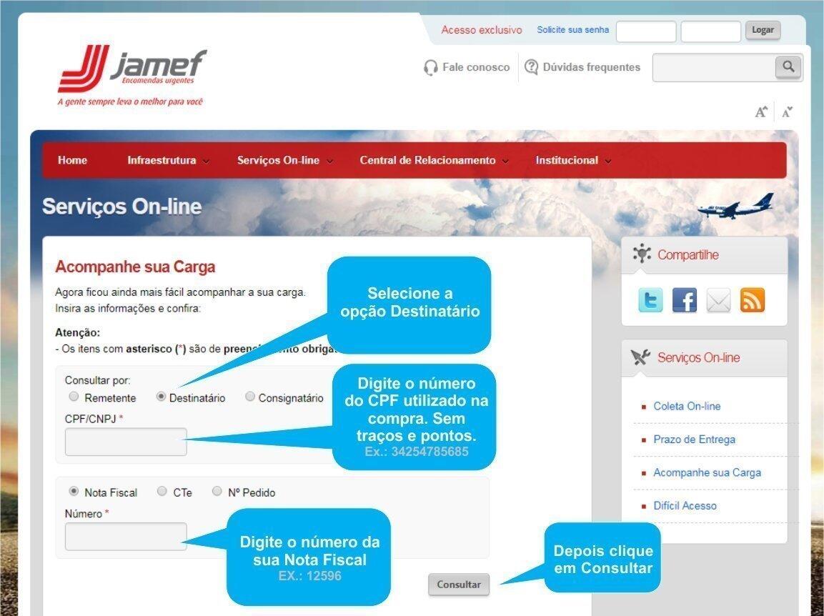Nesse caso você precisa ligar diretamente na filial da transportadora mais próxima da sua cidade. Clique aqui e veja os telefones das filiais da Jamef. Ah! Tenha o número da Nota Fiscal e/ou número da CPF em mãos.