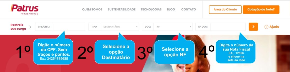 Seu pedido foi enviado com a transportadora Patrus Transportes. Para fazer o rastreio é bem simples. Veja na imagem abaixo e depois Clique aqui.