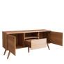 - Pés em madeira maciça: reforçam o estilo retrô e a estabilidade do móvel.