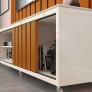 2 Portas de correr Rodízios de silicone Portas com acabamento ripado Tampo duplo Design moderno Painel Ripado com bordas laqueadas Painel com prateleira superior de 25mm