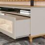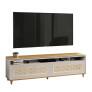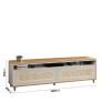 2 gavetas com corrediças telescópicas Gavetas com acabamento em Rathan Gavetas com puxadores telescópicas Pés de madeira maciça Tampo duplo em MDF com borda laqueada. Design moderno Atenção: Não acompanha Painel Para TV
