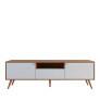Seu tampo robusto em MDP de 25mm oferece excelente suporte para TVs e objetos decorativos. A gaveta com corrediças telescópicas garante abertura suave, enquanto o espaço central é ideal para acomodar aparelhos eletrônicos. Os puxadores em ABS e os pés em madeira maciça completam o visual retrô com muito estilo e durabilidade.